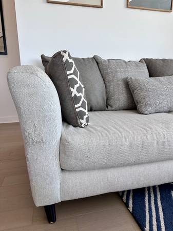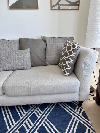 This is a Raymour and Flanigan Kinsella sofa with original retail value of $750. Very comfortable and clean. Lightly used (please see photos for some loose threads at the arms that can easily be covered by a sofa cover or blanket).