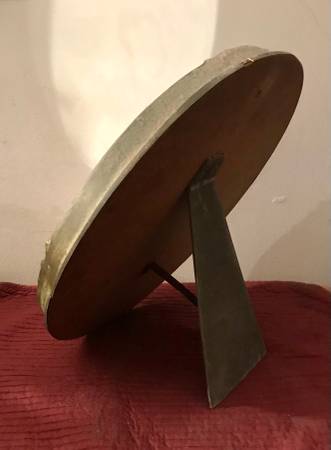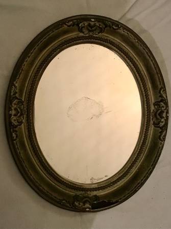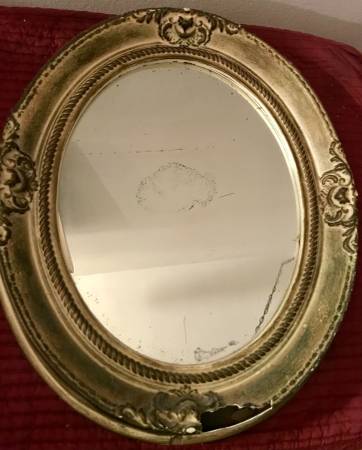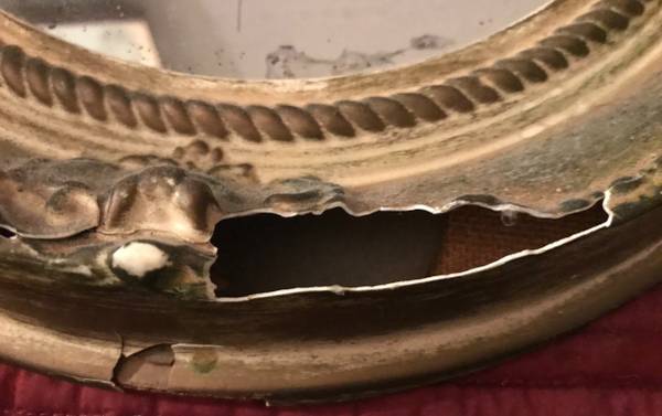 A chunk is missing from the bottom of the frame. You could make it a project to do a repair. But given that this old replica of an antique is almost old enough to be an antique itself, the missing piece only adds to its shabby chic charm.