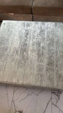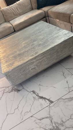 Square Z Gallerie “Timber” coffee table in a bright silver finish, with deep wood-grain grooves across the top that feel like weathered timber frozen in metal.