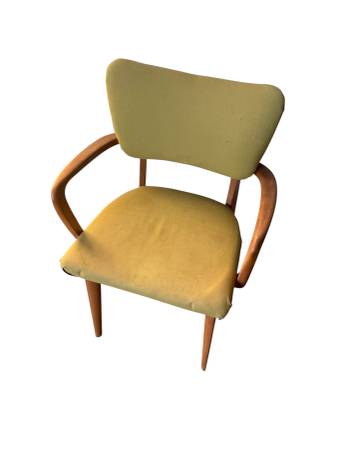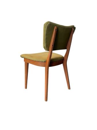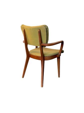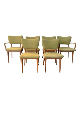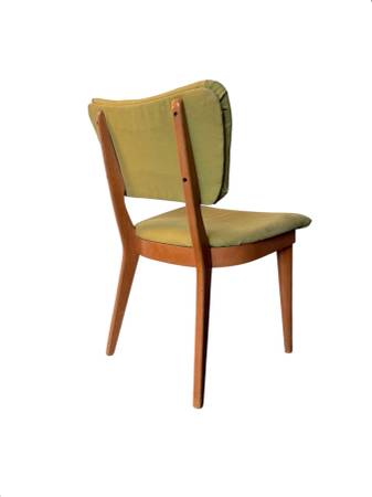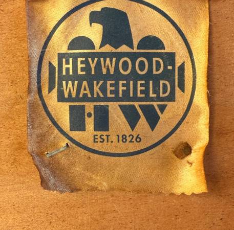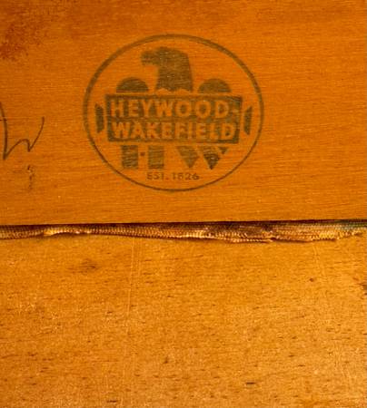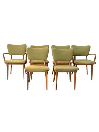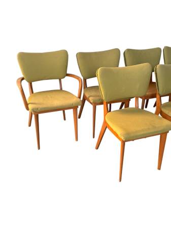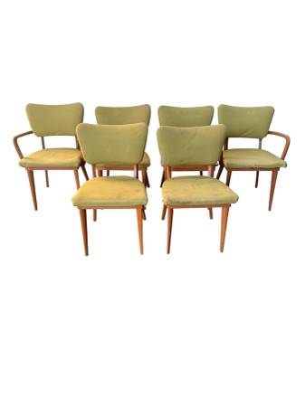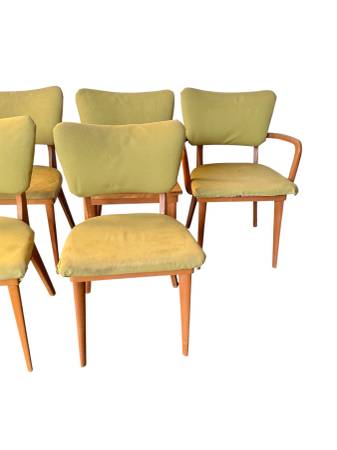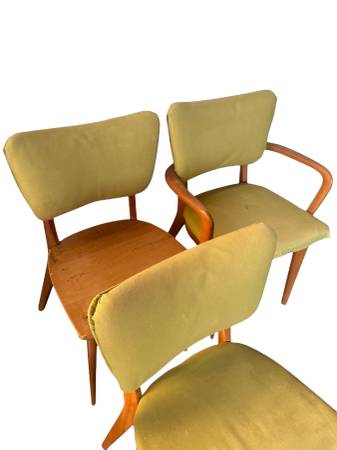Unique and rare set of Heywood Wakefield dining chairs. Solid wood frames with reupholstered seat and back panels. Being sold for restoration and reupholstery. Wood in good condition with original finish. Signed and guaranteed authentic. Model number M1564 A. Reupholstery in leather available for additional $750