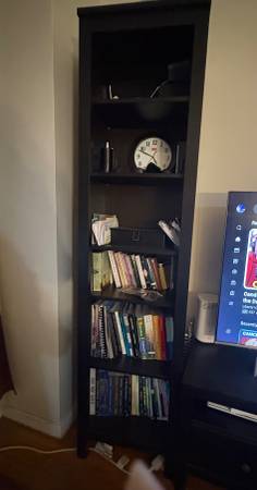 IKEA Hemnes bookcase black-brown, 19 1/4 x 77 1/2 " Original retail $279 selling for $50 each. Set of two in very good condition. Free round coffee table some surface scuffing can be painted out...