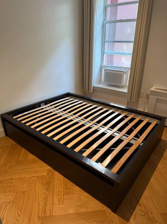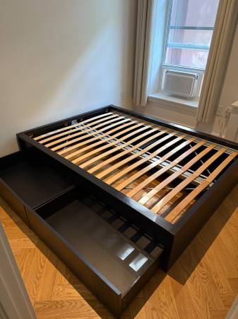 Finally parting with the bedframe I've had for nearly a decade. Excellent condition with a few scuff marks. With 4, large, rolling under-bed storage drawers (they fill the size of the entire frame), this is a real space saver for NY-size apartments. I didn't keep the headboard because I thought it made it look too IKEA. The frame + 4 boxes retails for $400 new.