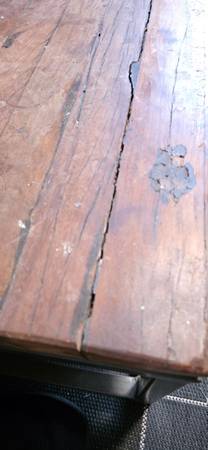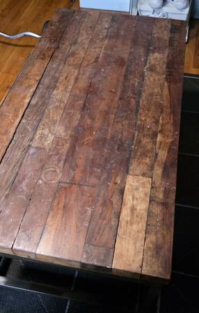 This table is in pretty good condition. The wood has seen some wear. It could be sanded & stained.