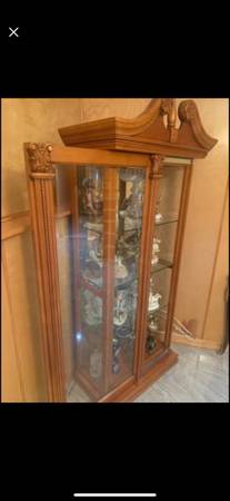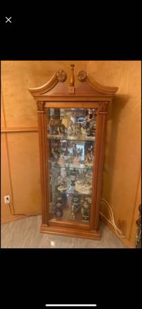 Beautiful hand carved natural wood Italian Curio with beveled glass sliding door was paid $2000