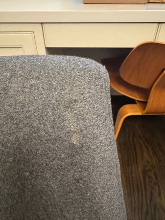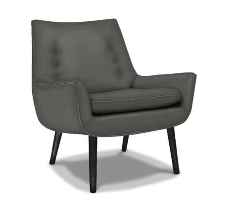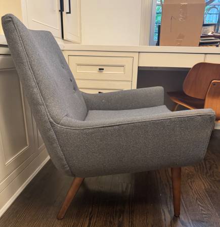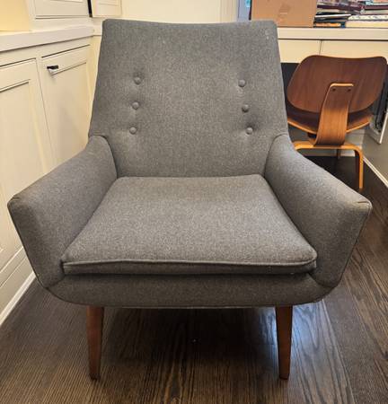 A Jonathan Adler "Mrs. Godfrey" chair, which retails for $2,300. This model is about eight years old, upholstered in gray flannel on walnut legs. Structurally, it is in very good condition. The upholstery shows some wear, and one of the buttons is loose.