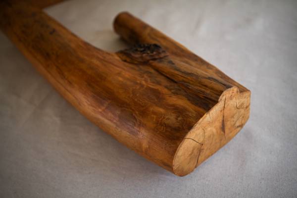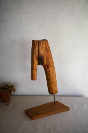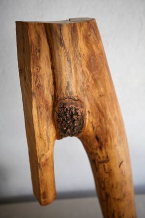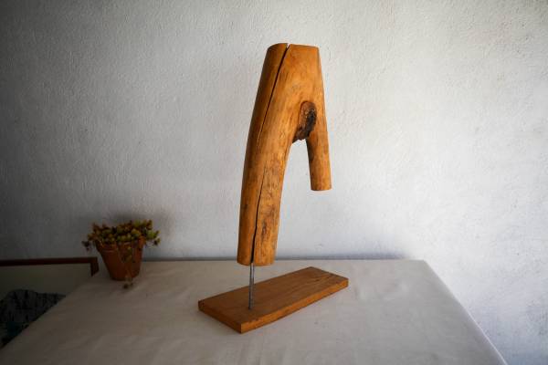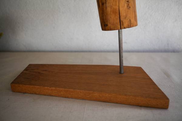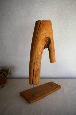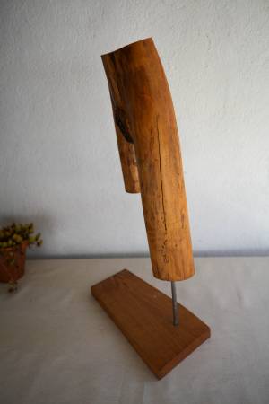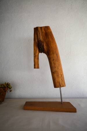 Lovely vintage live edge wood sculpture. Great organic form from all angles, giving pagan goddess vibes :). Signed by the artist on base (Kevin something, can’t make it out), dated 1993, and titled “Androgyny.” Rests on angular wooden base atop steel rod.
