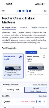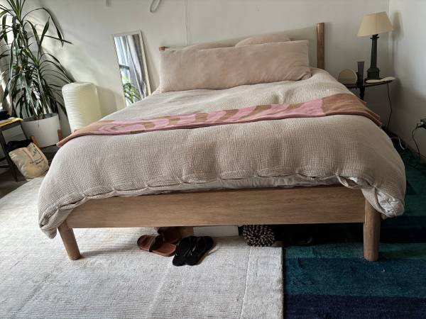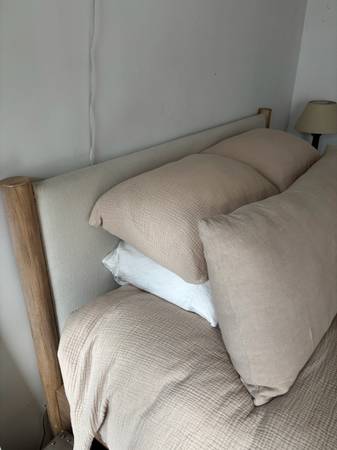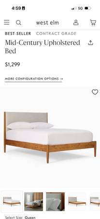 Like new West Elm Mid-Century Upholstered Bed Frame ($1299) and like new Nectar Classic Hybrid Mattress ($799). These are basically new and completely clean, I moved to NY last year in October, bought the bed, and left in July for a new job. We have an elevator to transport to car so no stairs. PICK UP IN DECEMBER (ideally Dec 20th)