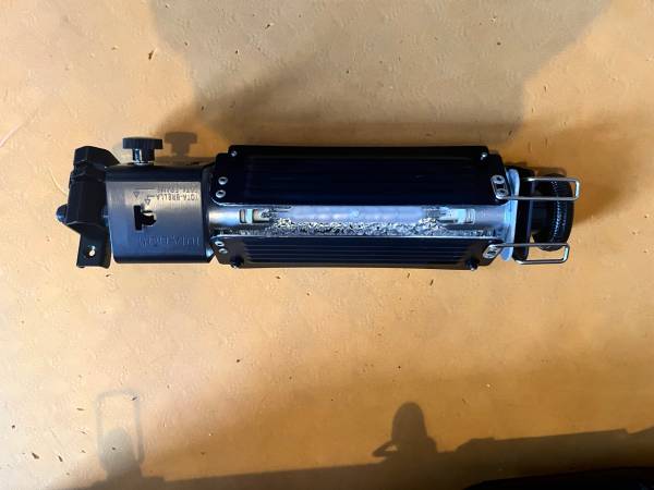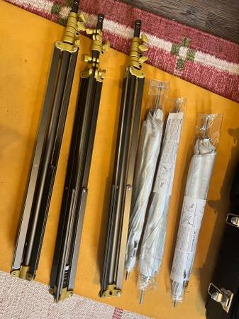 Practically unused lighting kit with various sized tripods, lighting attachments and other accessories. In brand new condition.