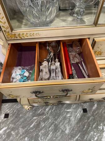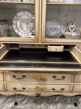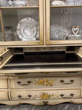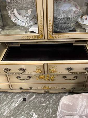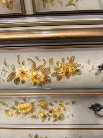 The lower drawers curve outward and are decorated with hand-painted yellow floral designs, each petal raised slightly so you can feel the texture, giving the piece a true French-country charm.