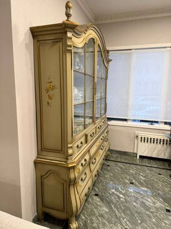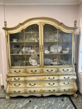 A tall antique breakfront curio painted in a warm cream tone with soft golden trims, featuring a grand arched top and clear glass doors that show every detail of the dishes inside.