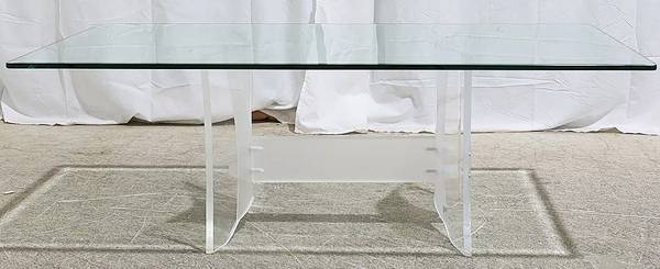 A mid century / modern coffee table with a butterfly lucite base and plate glass top. Nice looking table that doesn't appear to take up space. Form and function. Good overall condition- one small chip to underside at edge- see photos. Measures: 24" x 48" x 16" H.
