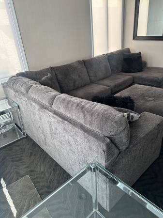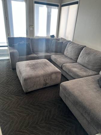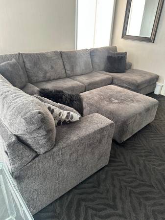Spacious gray modular sectional with oversized, deep seats that invite you to sink in and relax.