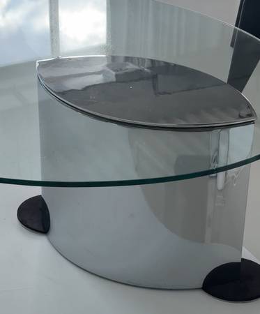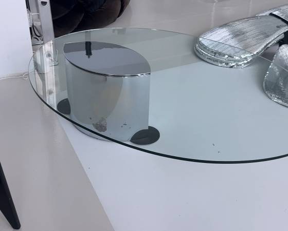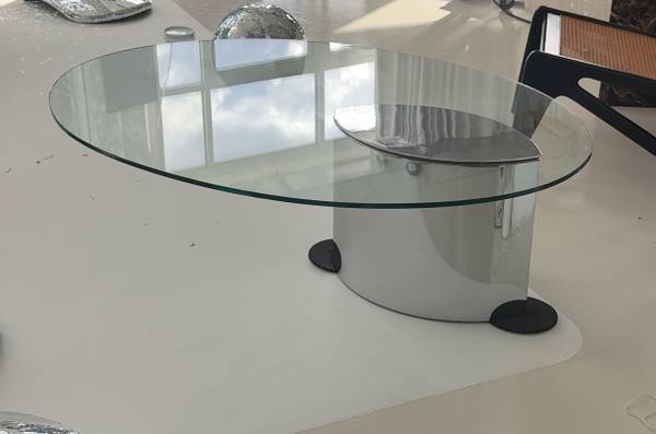 Elegant coffee table by Cini Boeri . Designed for Knoll. Features thick, oval, polished tempered glass top supported by an off-set steel base. A unique and sturdy system of concealed weights function as counterbalance. Born Maria Cristina Mariani Dameno, Cini Boeri was an Italian architect and designer known for her interest in functionalism who created sophisticated spaces and refined domestic objects. Dimensions: 59” long x 43.5” wide x 16” high.