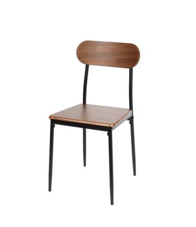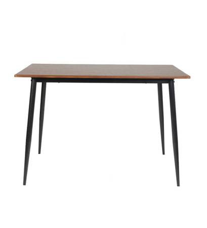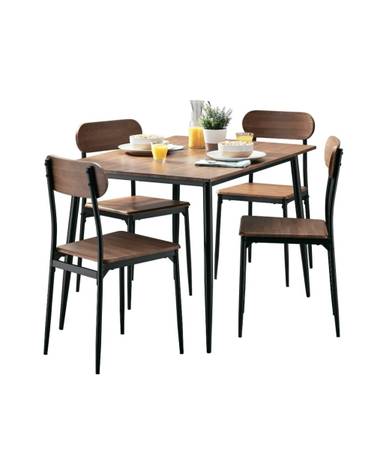 Brand new in box. Includes 1 rectangular table (45.25” L x 31.5” W x 30” H) and 4 chairs (16.5” W x 18” D x 33.75” H). Metal frame with walnut-effect wooden top and seats. Table supports up to 100 lbs, chairs up to 300 lbs each. Easy to assemble and clean.