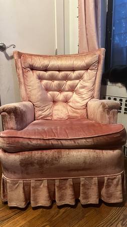 Super comfy pink velvet arm chair. It rocks back wards. The is a small rip on the back shown in the last photo. it's available. Message me when you want to pick up. I'm by Dekalb L stop. It will fit...