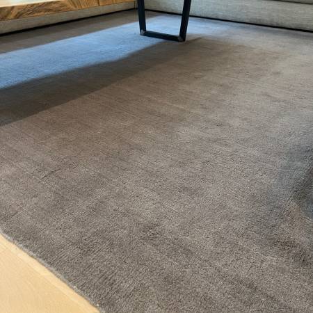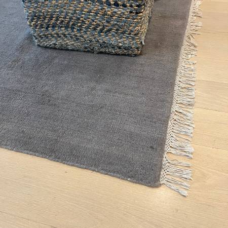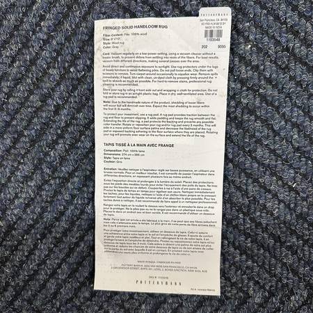 Details: 100% wool rug by Pottery Barn in a medium gray tone with fringed tassel edges. We purchased this 4 years ago and used the space only very lightly. Very neutral tone could go with most furniture setups. It has a short soft pile that is comfortable and welcoming.