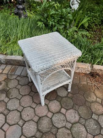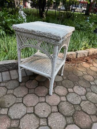 Real wicker end table is in good shape. This can be used as is or repaint it. This can be used on a covered space or inside. The table measures 18” square x 28” tall.