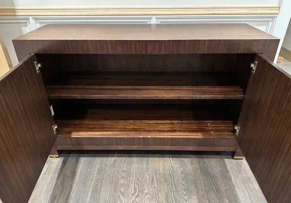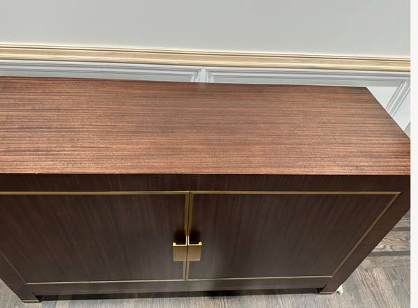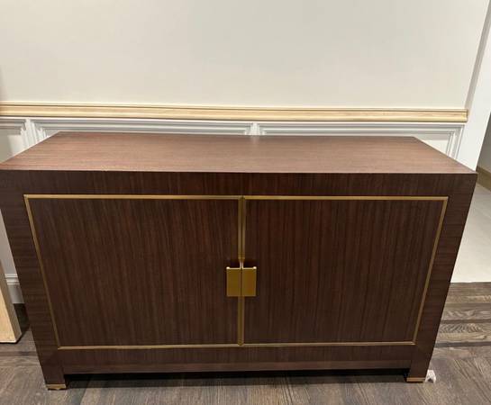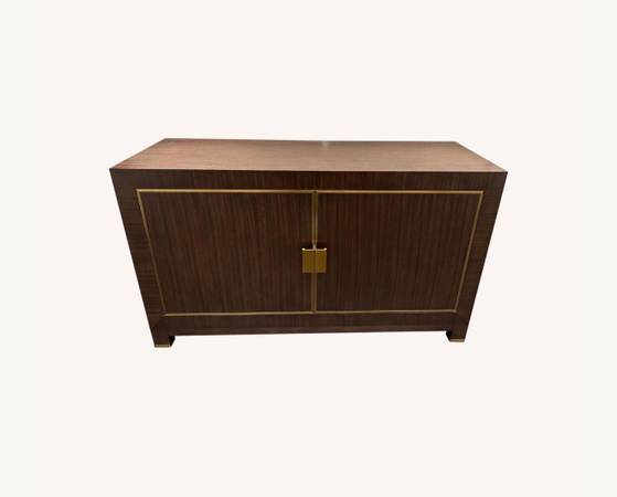 thin brass trim frames the front panels, meeting at the center where two square brass handles give it a polished, tailored finish. Its low, boxy silhouette sits confidently on squared legs, making it both bold and understated in one glance.