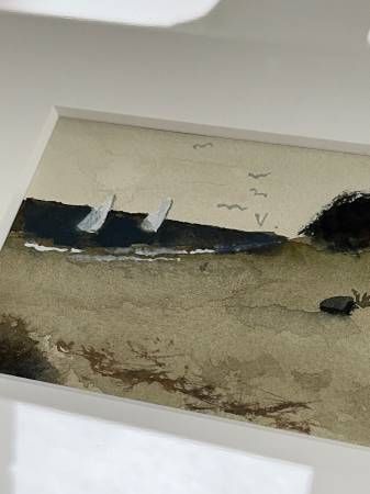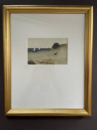 painting area is 6x4” frame is 12.5x15.5” custom framing job in UV glass beautiful gilded solid wood frame creamy white thick mat with beveled opening watercolor depicts seaside sand dunes and two...