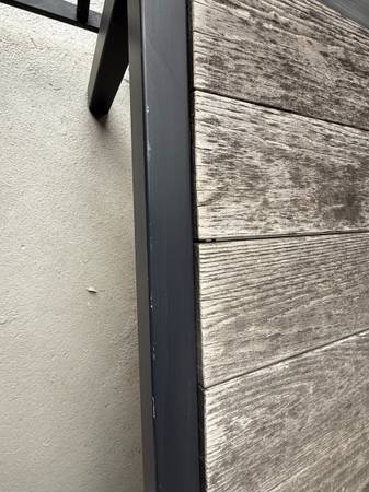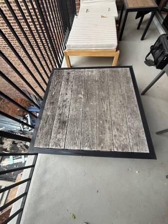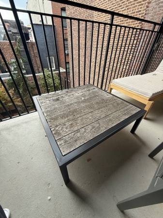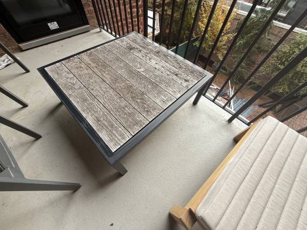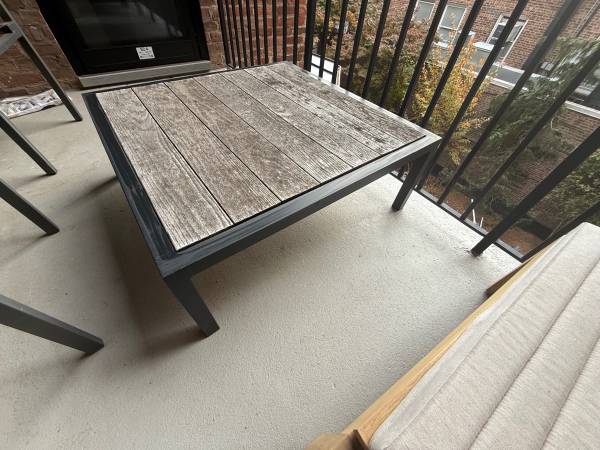Beautiful outdoor coffee table that is too big for my new apartment/patio (despite my best efforts). Natural discoloration - thermally modified ash will naturally develop a silver-grey color. There is a tiny wobble that's only noticeable because I was testing for it. Some noticeable scratches etc. consistent with three-year-old outdoor furniture in a four-season environment.