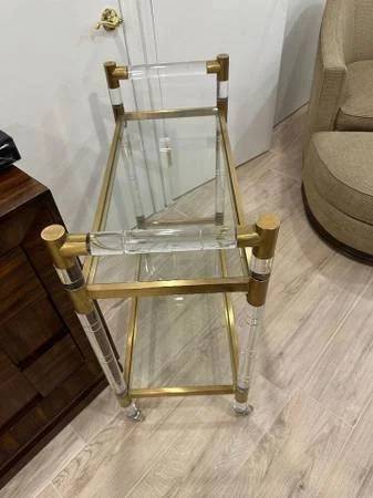 Add a spark of modern vibe to your room with this Safavieh Couture Collection Duval Bronze Acrylic Bar Trolley. Cocktail hour will always be chic with the Duval Bar Trolley. Inspired by the lush, art deco style found in Claridge’s Fumoir Bar, a bronze brass finish is paired with striking acrylic and brass detail for extra elegance. Its easy to clean just wipe it down with a warm cloth.