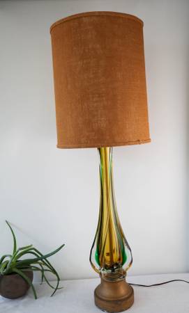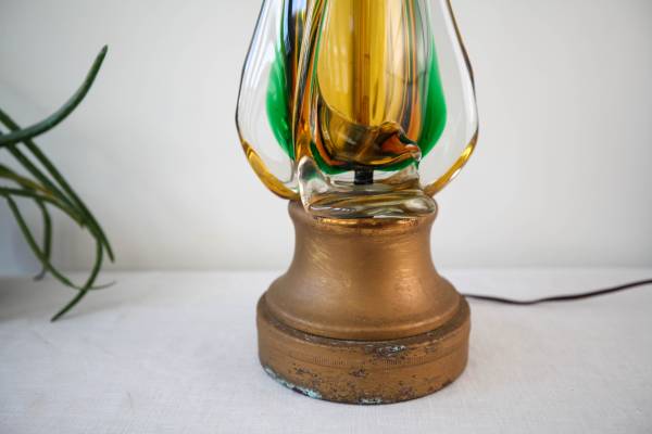 Monumental vintage Murano glass table lamp. Sommerso hand blown green and gold glass encased in clear. Very good vintage condition with original wiring. The brass base shows tarnish and wear - see pics.