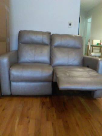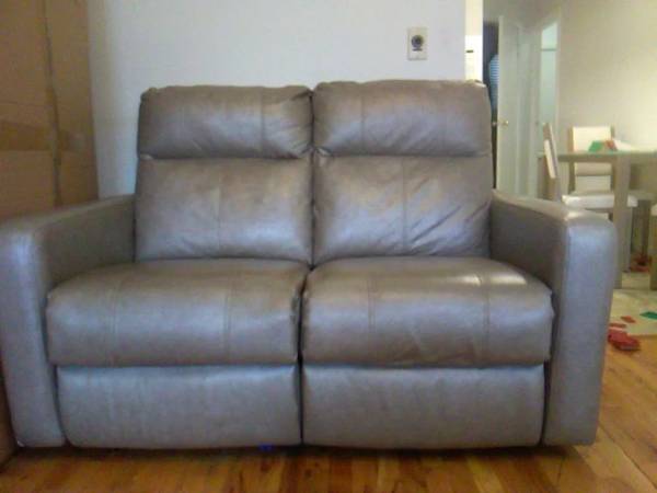 Taupe leather reclining loveseat sofa for two.