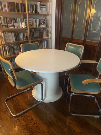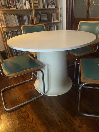 Stylish dining table from the 70s. Part of Kay Leroy Ruggles' UMBO furniture line for Directional Industries. Molded abs plastic table base with laminate table top.