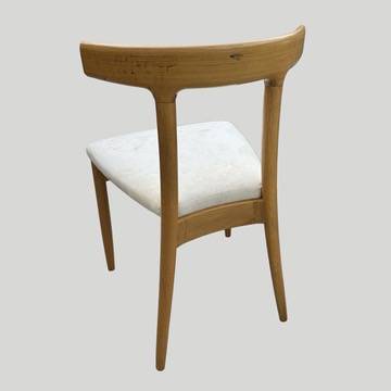 Details: Minimalist Danish-style chair in the style of Hans J. Wegner’s “Elbow Chair” (Model CH20). Solid beech or oak wood frame with sculpted contoured backrest, reflecting Scandinavian modern craftsmanship and organic natural lines. White trapezoidal upholstered seat with slender tapered legs. Seamless joinery and clean minimalist design. Mid-century modernist timeless and versatile design.