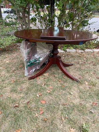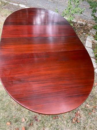 Vintage antique solid mahogany pedestal dining table with 2 leaves is in good shape. This table has a few scratched in the top which can be sanded out and refinished. This is solid mahogany has two extensions and table pads to protect the table. This measures 42”w x 54”L x 29”h with each leaf 12” making the table 78”L x 42”w.