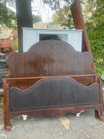 Vintage antique walnut depression full size be with side rails is in good shape. This is made of wood construction with different walnut veneers on it. This can be used as is or painted to give it a new look. This measures 57”w x 51” headboard height x 28.5 footboard height x 80”L.