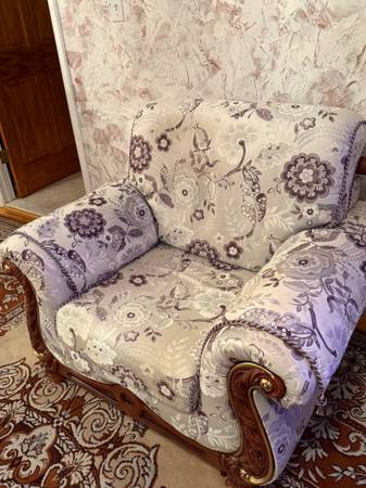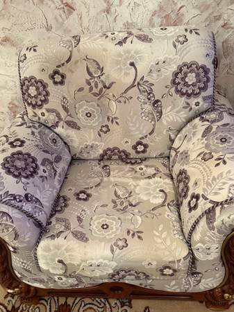 Beautiful floral-upholstered armchair with solid wood detailing. Clean, comfortable, and well-kept in a smoke-free, pet-free home. Includes matching pillows.