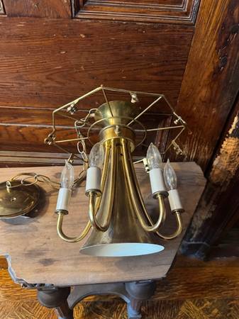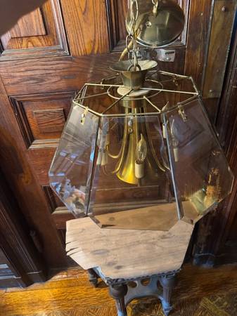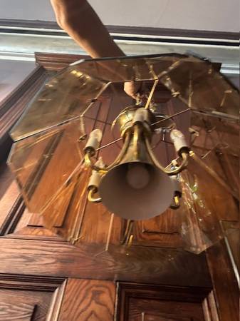 Vintage brass and beveled smoked glass chandelier is in good shape. This has six candle bulbs and one center bulb. The chandelier measures 24” round x 12” tall and 32” long from ceiling.