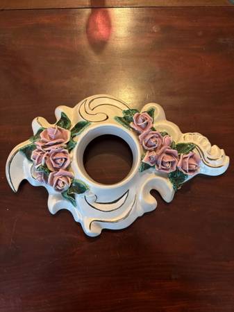 Vintage Capodimonte style wall art is in good shape. This has some chipping in it which can be touched up. This can have a clock or mirror mounted in it and hung on the wall. This measures 16” long 10” wide 2.5” deep, center hole 3.5” diamete.