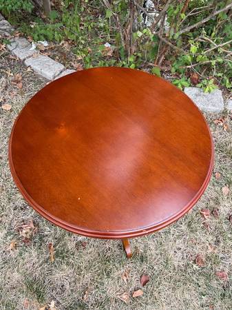 Vintage cherry round pedestal side table is in good shape. This has some minor chipping on the edge which can be touched up or put towards the back. The top does come off for easy moving. This measures 23”w x 27”h.