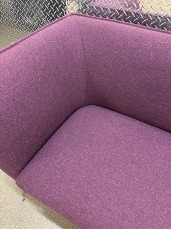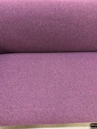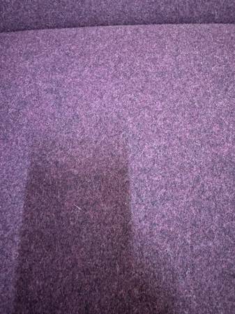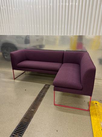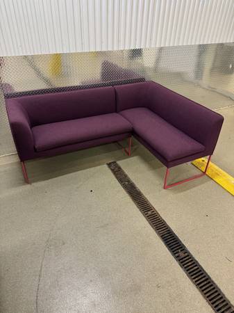 Vintage custom modern purple purple wool sofa sectional by by COR is in good shape. These two put together make an L shape and can be separated. This can be used as banquet seating for a dining area as well. Each section measures 55” long 26” deep 32” tall, 20” seat height and as L setup measures 81”x51”.