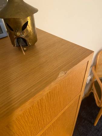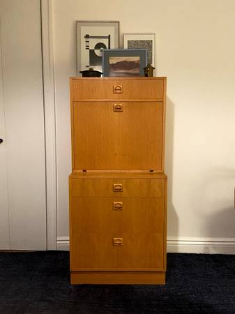 Vintage midcentury teak cocktail cabinet/dresser, c. 1970s, Made in Denmark. Two separate pieces, stacked. Bottom cabinet has three drawers on sliders, top has one drawer and one drop-down hinged door, with mirror and adjustable glass shelf inside. Top drawer of the top piece has damaged handle, but I have a replacement for it! In excellent shape with a few minor dings - a couple veneer chips (pictured). Some sun fading on the bottom portion when top is removed.