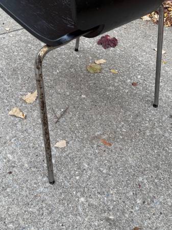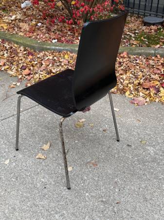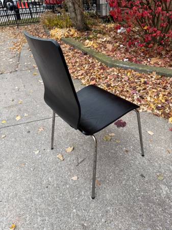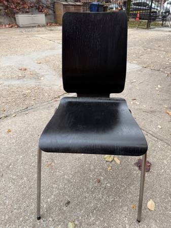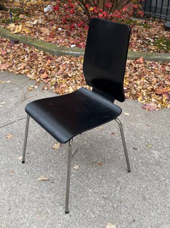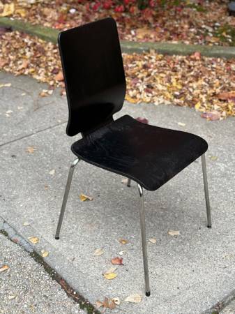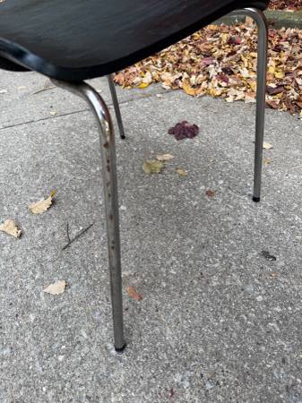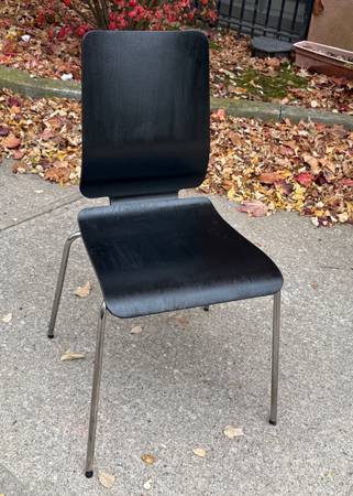 Classic mid-century design featuring a stylish combination of a black wooden seat and polished steel four-leg frame.