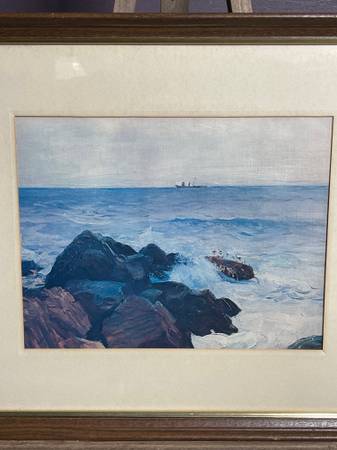 Vintage Framed Ocean rocks print is in good shape. This print is framed and matted and can be hung as is or reframed. This measures 22"w x 18"h.
