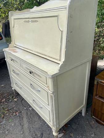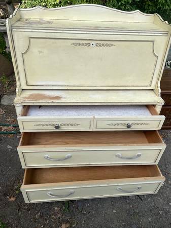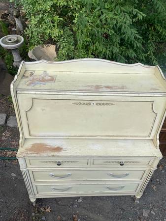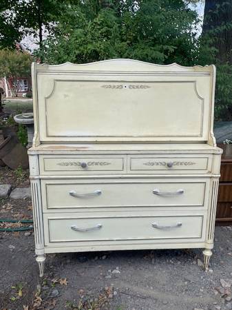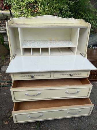 Vintage French provincial cream painted three drawer dresser secretary is in good shape. This is made of wood and can be stripped and stained or painted. The drop down desk is a Formica. This also can be used as is and could just change out the hardware to get a new look. This measures 39”w x 19”d x 48”h with the drawers at 34”w x 3”, 6.5, 6.5d.