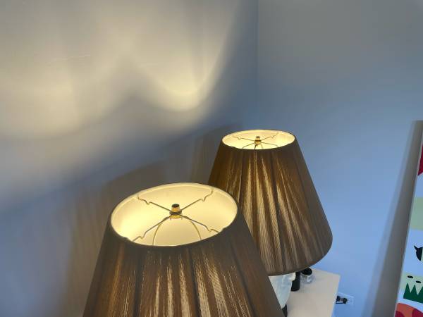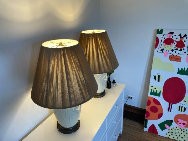 Brass base with an off white cream ceramic, urn-shaped body. Raised floral lily design with a light crackle texture and visual interest. Large empire/bell-shaped string shades in a copper-brown hue. Pretty glow.