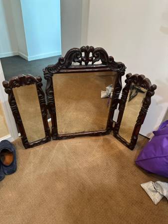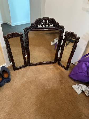 Vintage Louis XV vanity set with deep mahogany wood tones, intricate carvings, and elegant cabriole legs.