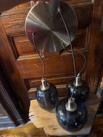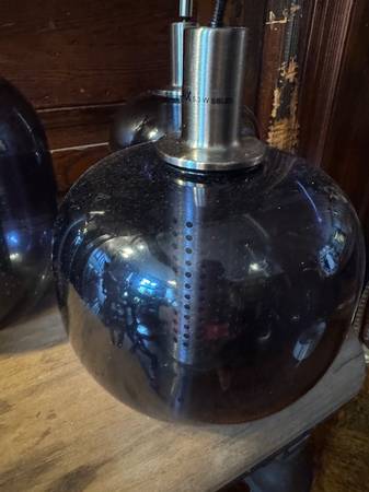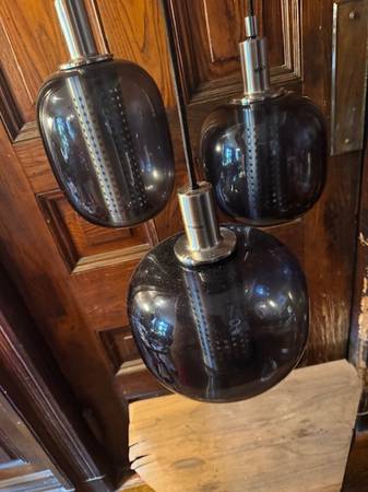 Vintage mid century modern looking three light smoked glass pendant chandelier is in great shape. This light fixture mounts to the ceiling and has lovely smoked glass. This could be added to any space for that touch of modern.