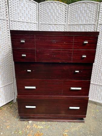 Vintage mid century modern dark mahogany five drawer dresser is in good shape. This is made of wood construction with a mahogany veneer on it. This measures 40”w x 20”d x 52”h with the drawers 37”w x 5”d, 5, 8.5, 8.5, 9.5.