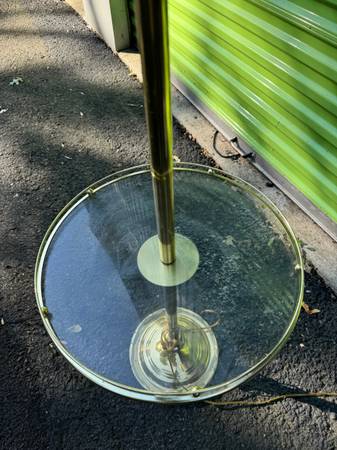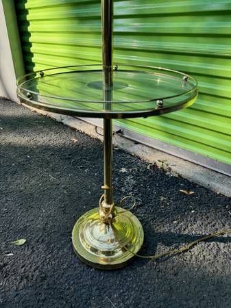 Vintage mid century modern brass and glass table with build-in lamp is in great shape. This has a built-in lamp and just need to ass a glass globe to your liking. This measures 16” round 48” tall, table height 21”.