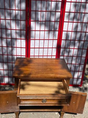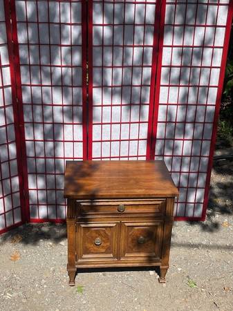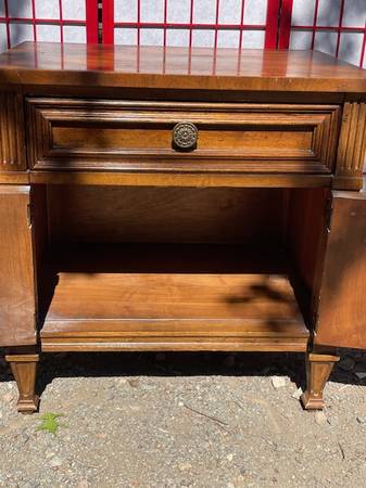 Vintage modern walnut nightstand by Drexel is in good shape. This is made of wood construction with walnut veneers on it. This measures 24”w x 24.5”h x 17”d with the drawer 18w x 3.5” d.