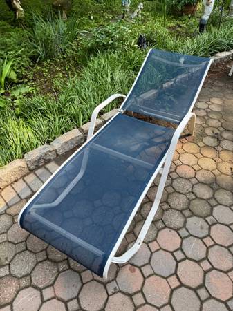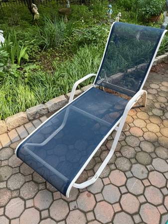 Vintage modern white with blue sling patio lounge chair is in good shape. This is made of blown aluminum with a blue mesh sling. There is no wear or fading on the sling and the back has multiple options to go up and down. This measures 78 inches long by 27 inches wide 13 inches tall. 2 available.