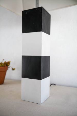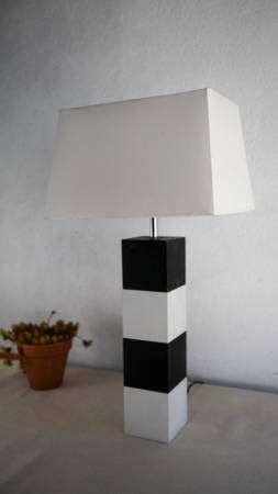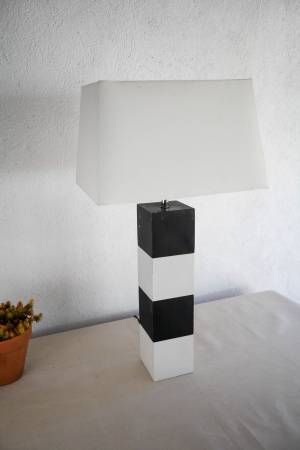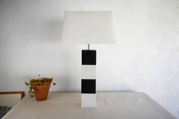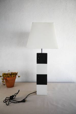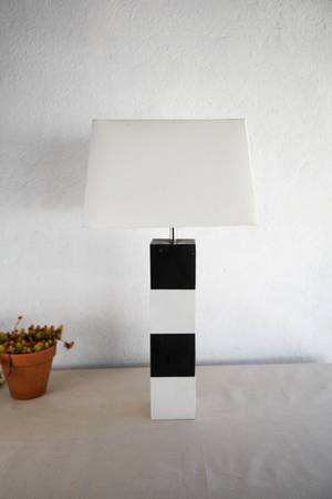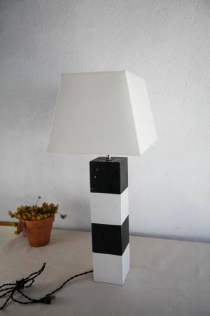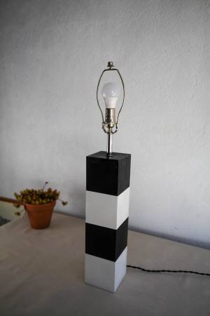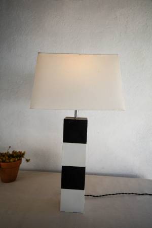 Late modern / postmodern rectilinear metal table lamp with black and white color blocked enamel. In excellent vintage condition with some light scuffs/wear to the finish, see pics, and new wiring. Shade pictured can be included for small add on, but be advised that it is not original to the lamp, and may show minor wear.