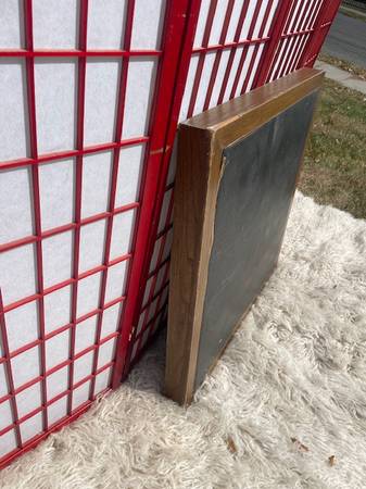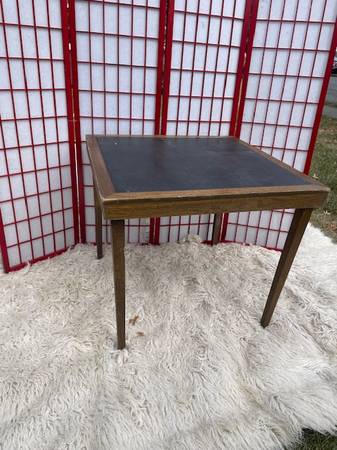 Vintage oak and vinyl folding card table is in good shape. This is made of oak with a darker finish and can be refinished or used as is. This folds up to fit into tight spaces. This measures 32.5” w x 28”h.