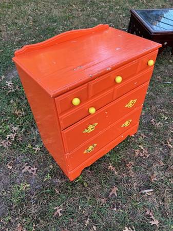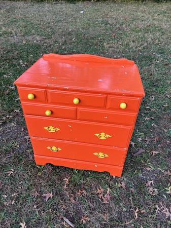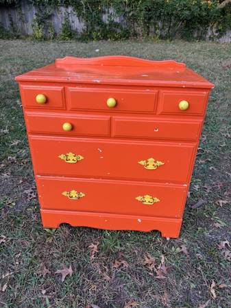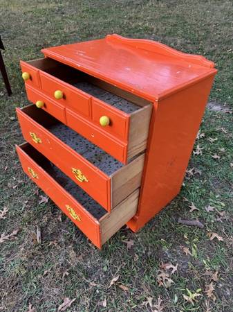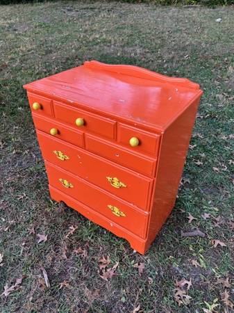 Vintage orange painted maple three drawer dresser is in good shape This is made of solid wood and has been painted. This can be stripped and stained, used as is or painted another color. This measures 28 inches wide by 16 inches deep by 30 inches tall drawers are all 25 inches wide by 6 1/2 inches deep.